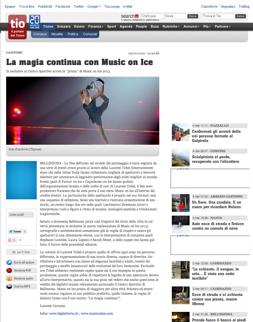 LA REGIONE TICINO: "Music on Ice tra pattinaggio e teatro"